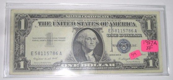 1957 SERIES A $1 SILVER CERTIFICATE BILL SERIAL #E58115786A *RARE EXTRA FINE GRADE*!! BILL CAME OUT OF SAFE!! ***Coin, Currency & All Items Listed in this auction - Grades, Conditions and Values are not Safe Deposit Coins LLC Responsibilty. Grades, Condition and Values are determined by Consigner(s) & Buyers ONLY