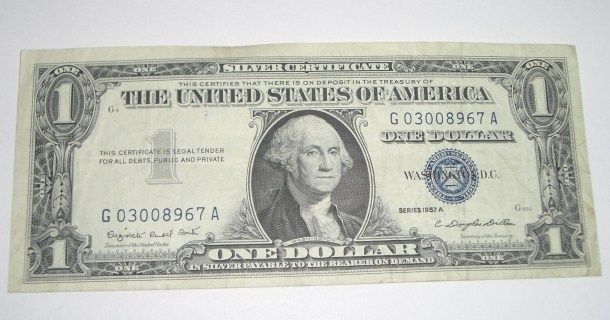 1957 SERIES A $1 SILVER CERTIFICATE BILL SERIAL # G03008967A *NICE BILL PLEASE LOOK AT PICTURE TO DETERMINE GRADE*!! ***Coin, Currency & All Items Listed in this auction - Grades, Conditions and Values are not Safe Deposit Coins LLC Responsibilty. Grades, Condition and Values are determined by Consigner(s) & Buyers ONLY