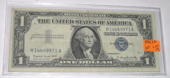 1957 SERIES A $1 SILVER CERTIFICATE BILL SERIAL # H14469971A *RARE EARLY EXTRA FINE GRADE*!! DOLLAR BILL CAME OUT OF SAFE!! ***Coin, Currency & All Items Listed in this auction - Grades, Conditions and Values are not Safe Deposit Coins LLC Responsibilty. Grades, Condition and Values are determined by Consigner(s) & Buyers ONLY***