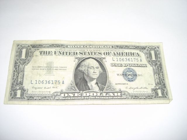 1957 SERIES A $1 SILVER CERTIFICATE *SERIAL #L10636175A*!! ***Coin, Currency & All Items Listed in this auction - Grades, Conditions and Values are not Safe Deposit Coins LLC Responsibilty. Grades, Condition and Values are determined by Consigner(s) & Buyers ONLY***