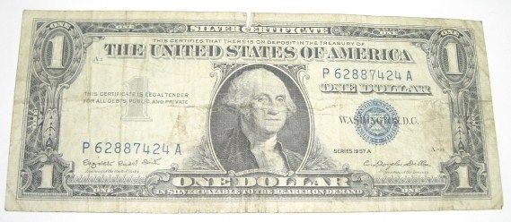 1957 SERIES A $1 SILVER CERTIFICATE BILL SERIAL #P62887424A *PLEASE LOOK AT PICTURE TO DETERMINE GRADE*!!! ***Coin, Currency & All Items Listed in this auction - Grades, Conditions and Values are not Safe Deposit Coins LLC Responsibilty. Grades, Condition and Values are determined by Consigner(s) & Buyers ONLY***