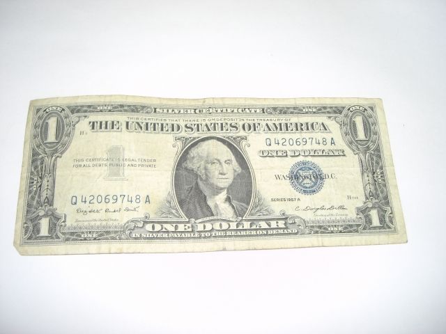 1957 SERIES A $1 SILVER CERTIFICATE *SERIAL #Q42069748A*!! ***Coin, Currency & All Items Listed in this auction - Grades, Conditions and Values are not Safe Deposit Coins LLC Responsibilty. Grades, Condition and Values are determined by Consigner(s) & Buyers ONLY***