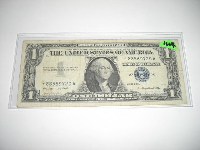 1957 SERIES A RARE SILVER CERTIFICATE *STAR NOTE* $1.00 SERIAL # *88569720A. DOLLAR CAME OUT OF SAFE!! ***Coin, Currency & All Items Listed in this auction - Grades, Conditions and Values are not Safe Deposit Coins LLC Responsibilty. Grades, Condition and Values are determined by Consigner(s) & Buyers ONLY