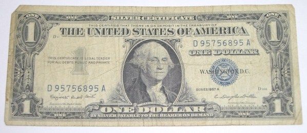 1957 SERIES A SILVER CERTIFICATE $1 SERIAL # D95756895A *NICE BILL PLEASE LOOK AT PICTURE TO DETERMINE GRADE*!! ***Coin, Currency & All Items Listed in this auction - Grades, Conditions and Values are not Safe Deposit Coins LLC Responsibilty. Grades, Condition and Values are determined by Consigner(s) & Buyers ONLY***