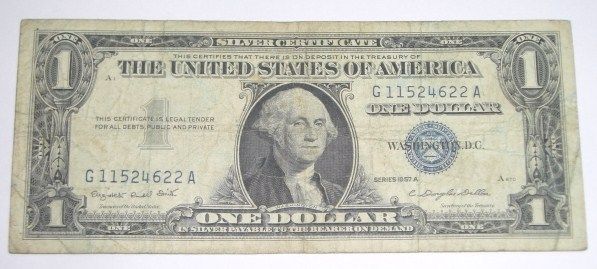 1957 SERIES A SILVER CERTIFICATE $1 SERIAL # G11524622A *NICE BILL PLEASE LOOK AT PICTURE TO DETERMINE GRADE*!! ***Coin, Currency & All Items Listed in this auction - Grades, Conditions and Values are not Safe Deposit Coins LLC Responsibilty. Grades, Condition and Values are determined by Consigner(s) & Buyers ONLY***