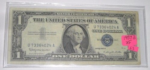 1957 SERIES B $1 SILVER CERTIFICATE BILL SERIAL # U73364024A *RARE EXTRA FINE GRADE*!! BILL CAME OUT OF SAFE!! ***Coin, Currency & All Items Listed in this auction - Grades, Conditions and Values are not Safe Deposit Coins LLC Responsibilty. Grades, Condition and Values are determined by Consigner(s) & Buyers ONLY
