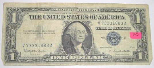 1957 SERIES B $1 SILVER CERTIFICATE BILL SERIAL #V73331883A *NICE EARLY U.S. BILL*!! ***Coin, Currency & All Items Listed in this auction - Grades, Conditions and Values are not Safe Deposit Coins LLC Responsibilty. Grades, Condition and Values are determined by Consigner(s) & Buyers ONLY***