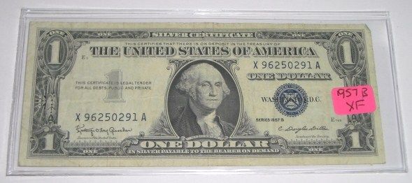 1957 SERIES B $1 SILVER CERTIFICATE BILL SERIAL # X96250291A *EXTREMELY RARE EXTRA FINE HIGH GRADE*!! ***Coin, Currency & All Items Listed in this auction - Grades, Conditions and Values are not Safe Deposit Coins LLC Responsibilty. Grades, Condition and Values are determined by Consigner(s) & Buyers ONLY