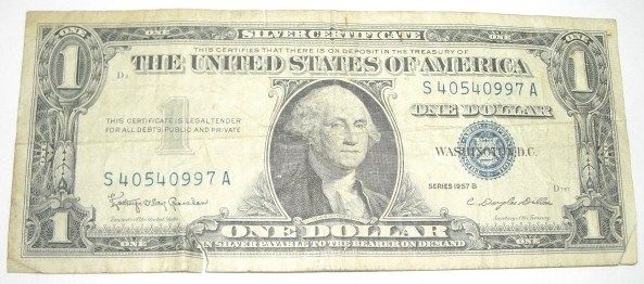 1957 SERIES B $1 SILVER CERTIFICATE SERIAL # S40540997A *PLEASE LOOK AT PICTURE TO DETERMINE GRADE*! ***Coin, Currency & All Items Listed in this auction - Grades, Conditions and Values are not Safe Deposit Coins LLC Responsibilty. Grades, Condition and Values are determined by Consigner(s) & Buyers ONLY
