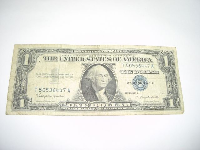 1957 SERIES B $1 SILVER CERTIFICATE *SERIAL #T50536447A*!! ***Coin, Currency & All Items Listed in this auction - Grades, Conditions and Values are not Safe Deposit Coins LLC Responsibilty. Grades, Condition and Values are determined by Consigner(s) & Buyers ONLY***