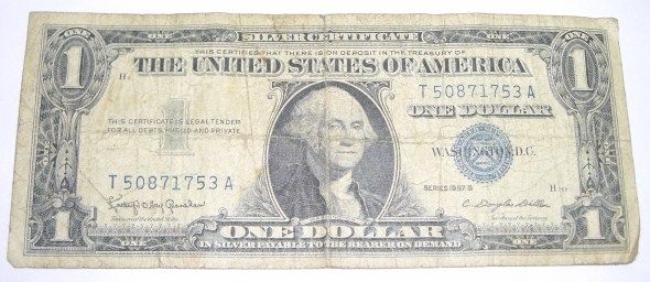 1957 SERIES B $1 SILVER CERTIFICATE SERIAL # T50871753A *PLEASE LOOK AT PICTURE TO DETERMINE GRADE*! ***Coin, Currency & All Items Listed in this auction - Grades, Conditions and Values are not Safe Deposit Coins LLC Responsibilty. Grades, Condition and Values are determined by Consigner(s) & Buyers ONLY
