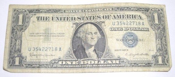 1957 SERIES B $1 SILVER CERTIFICATE SERIAL # U35422718A *PLEASE LOOK AT PICTURE TO DETERMINE GRADE*! ***Coin, Currency & All Items Listed in this auction - Grades, Conditions and Values are not Safe Deposit Coins LLC Responsibilty. Grades, Condition and Values are determined by Consigner(s) & Buyers ONLY