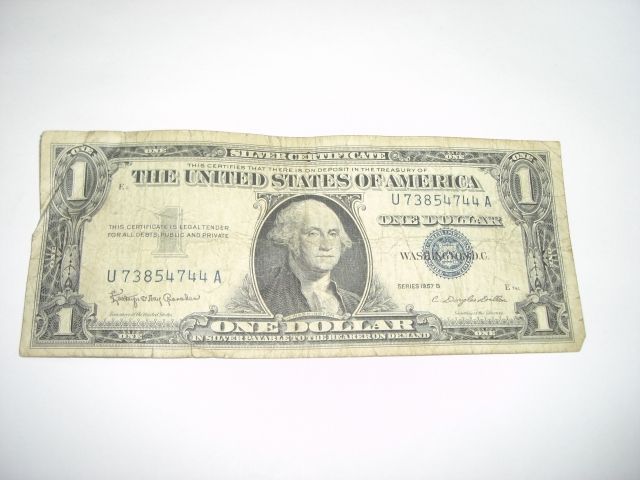 1957 SERIES B $1 SILVER CERTIFICATE *SERIAL #U73854744A*!! ***Coin, Currency & All Items Listed in this auction - Grades, Conditions and Values are not Safe Deposit Coins LLC Responsibilty. Grades, Condition and Values are determined by Consigner(s) & Buyers ONLY***