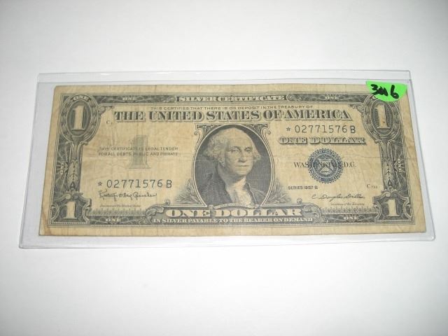 1957 SERIES B RARE SILVER CERTIFICATE *STAR NOTE* $1.00 SERIAL # *02771576B. DOLLAR CAME OUT OF SAFE!! ***Coin, Currency & All Items Listed in this auction - Grades, Conditions and Values are not Safe Deposit Coins LLC Responsibilty. Grades, Condition and Values are determined by Consigner(s) & Buyers ONLY