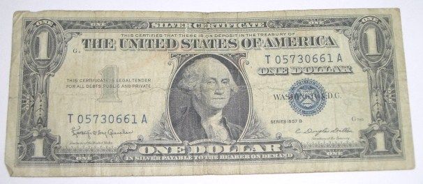 1957 SERIES B SILVER CERTIFICATE $1 SERIAL # T05730661A *NICE BILL PLEASE LOOK AT PICTURE TO DETERMINE GRADE*!! ***Coin, Currency & All Items Listed in this auction - Grades, Conditions and Values are not Safe Deposit Coins LLC Responsibilty. Grades, Condition and Values are determined by Consigner(s) & Buyers ONLY***