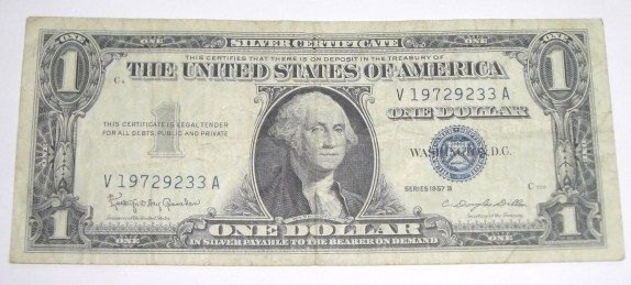 1957 SERIES B SILVER CERTIFICATE $1 SERIAL # V19729233A *NICE BILL PLEASE LOOK AT PICTURE TO DETERMINE GRADE*!! ***Coin, Currency & All Items Listed in this auction - Grades, Conditions and Values are not Safe Deposit Coins LLC Responsibilty. Grades, Condition and Values are determined by Consigner(s) & Buyers ONLY***