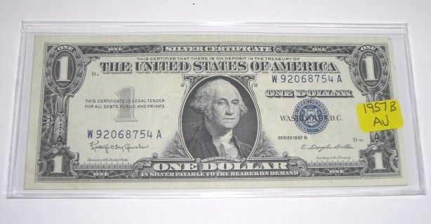 1957 SERIES B SILVER CERTIFICATE $1 SERIAL # W92068754A *EXTREMELY RARE AU HIGH GRADE*!! ***Coin, Currency & All Items Listed in this auction - Grades, Conditions and Values are not Safe Deposit Coins LLC Responsibilty. Grades, Condition and Values are determined by Consigner(s) & Buyers ONLY***