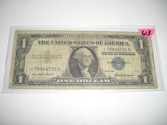 1957 SERIES SILVER CERTIFICATE RARE *STAR NOTE* $1.00 SERIAL # *79946731O. NICE EARLY US DOLLAR*!! DOLLAR CAME OUT OF SAFE!! ***Coin, Currency & All Items Listed in this auction - Grades, Conditions and Values are not Safe Deposit Coins LLC Responsibilty. Grades, Condition and Values are determined by Consigner(s) & Buyers ONLY