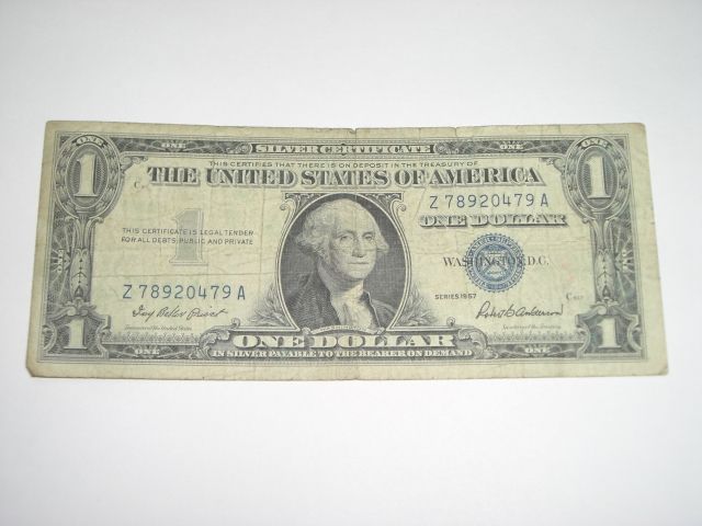 1957 SILVER CERTIFICATE $1 SERIAL # Z78920479A *NICE BILL PLEASE LOOK AT PICTURE TO DETERMINE GRADE*!! ***Coin, Currency & All Items Listed in this auction - Grades, Conditions and Values are not Safe Deposit Coins LLC Responsibilty. Grades, Condition and Values are determined by Consigner(s) & Buyers ONLY***