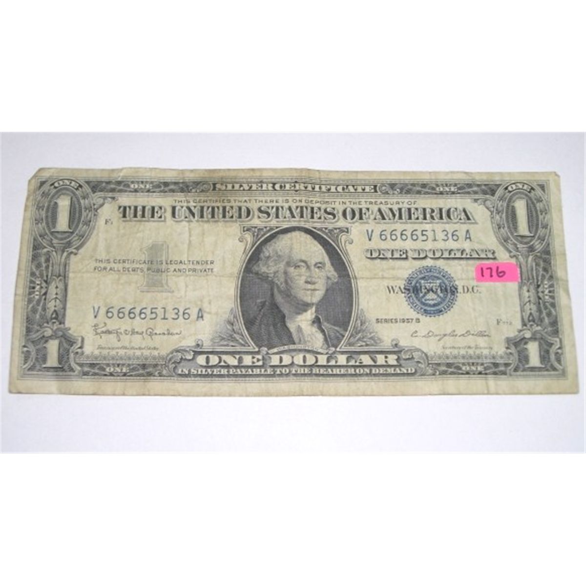 1957 Series B $1 Silver Certificate Serial # V66665136A!! ***Coin, Gemstone & All Items Listed in this auction - Grades, Conditions and Values are not Safe Deposit Coins LLC Responsibilty. Grades, Condition and Values are determined by Consigner(s) & Buyers ONLY***