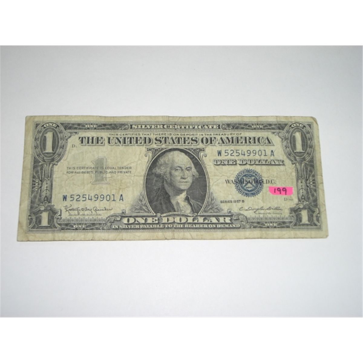 1957 Series B $1 Silver Certificate Serial # W52549901A!! ***Coin, Gemstone & All Items Listed in this auction - Grades, Conditions and Values are not Safe Deposit Coins LLC Responsibilty. Grades, Condition and Values are determined by Consigner(s) & Buyers ONLY***