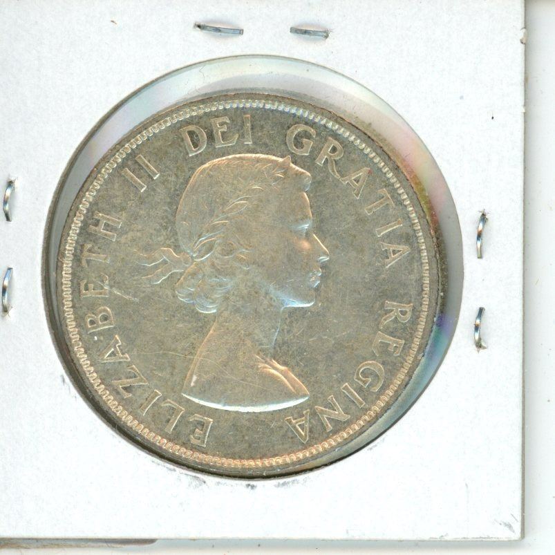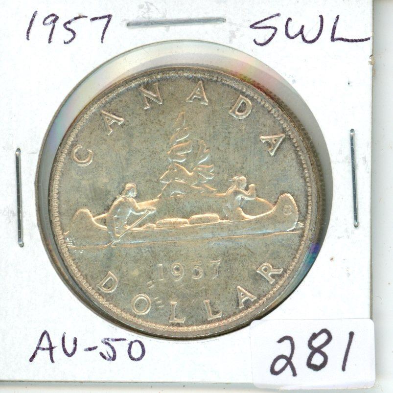 1957 Short Water Lines Silver Dollar. Short Water Lines in front of canoe. AU-50.