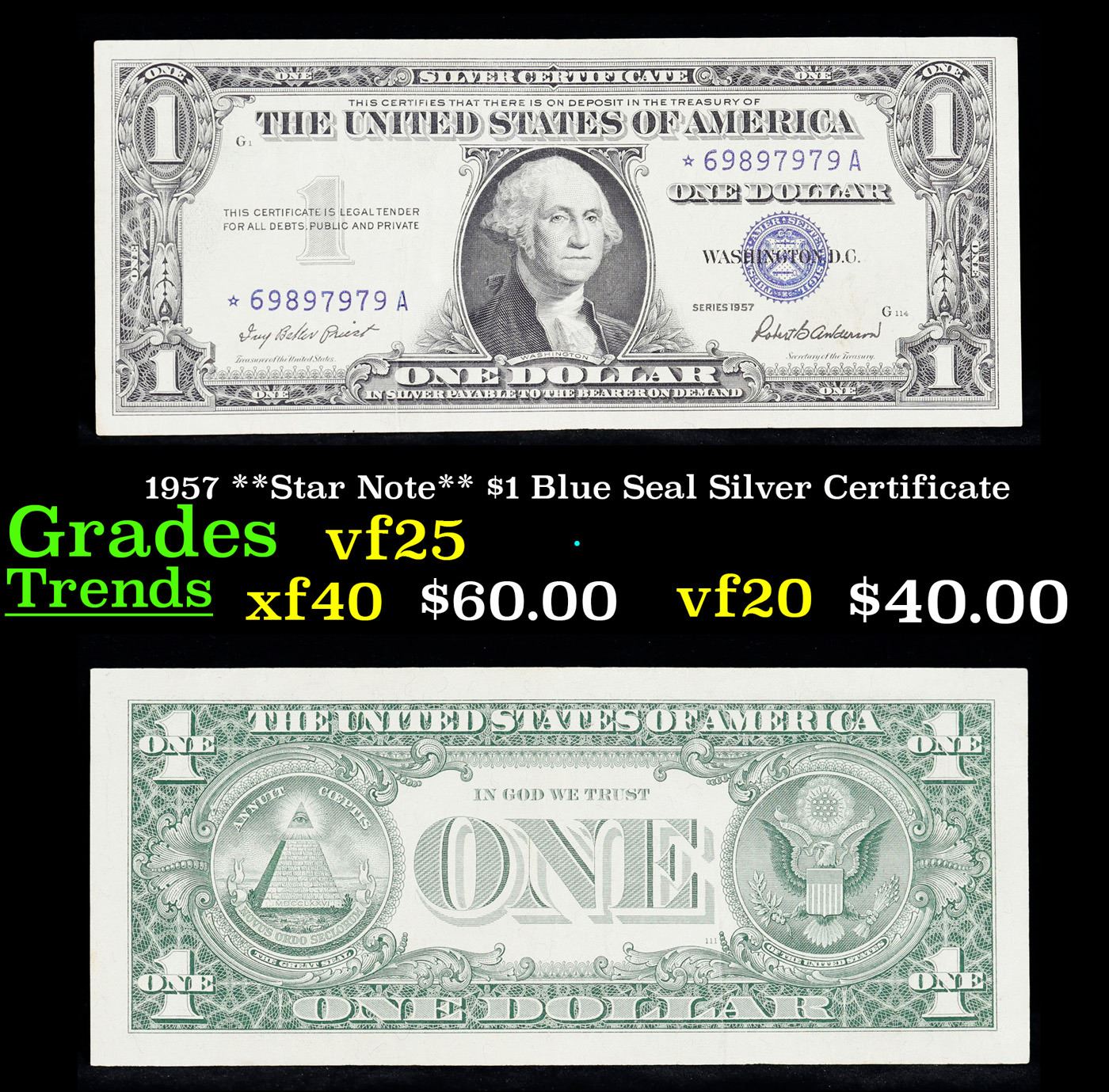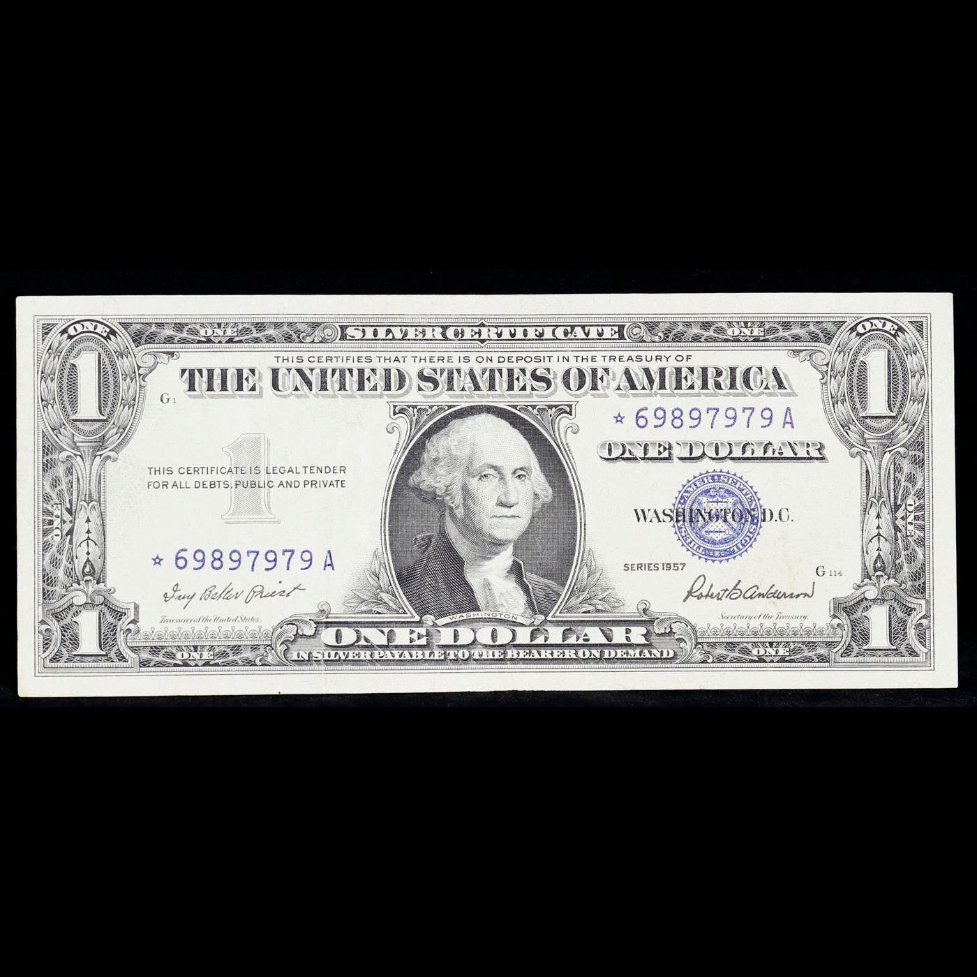 1957 **Star Note** $1 Blue Seal Silver Certificate Grades vf+. When notes are discovered that have been printed incorrectly (such as having the serial numbers upside down, etc.) the misprinted "error notes" are replaced with star notes because no two bills within a certain series can be produced with the same serial number. They are used to maintain a correct count of notes in a serial number run. By their nature, star notes are more scarce than notes with standard serial numbers and as such are widely collected by numismatists. Some of the highest prices paid for modern (post-1928) U.S. banknotes have been for star notes. The note itself is a Silver Certificate. Silver Certificates were redeemable in Silver. One of their most distinctive qualities is the blue Treasury seal and serial numbers. These notes include an additional legend printed on the face that is not present on any other Federal Reserve notes. The legend states that Silver had been deposited in the Treasury and was payable on demand to the note’s bearer.