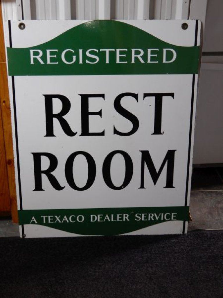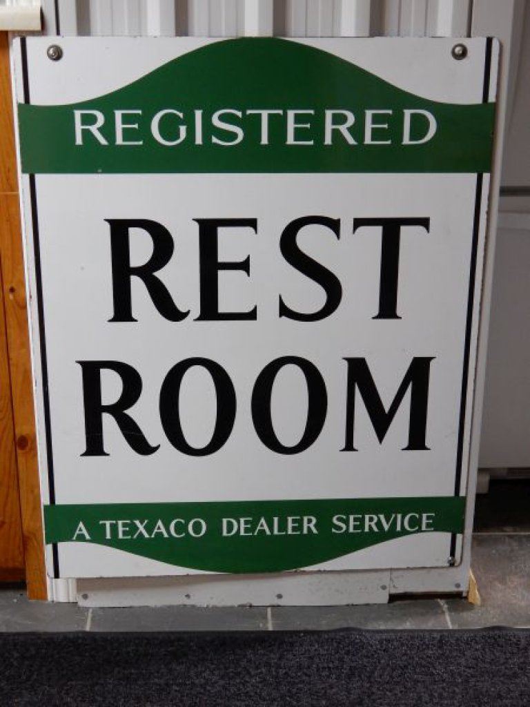 1957 TEXACO RESTROOM DSP SIGN P&M ORILLIA - 37 1/2" X 30" - SOME PORC. LOSS LOCATION: KITCHEN AREA
