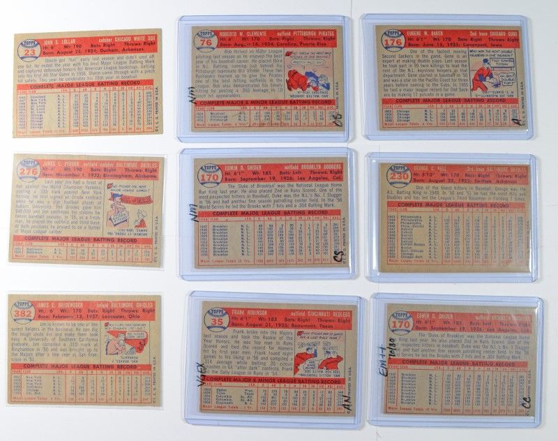 EST $550- $600, MOSTLY NM-EM, #23, #35 ROBINSON ROOKIE VGEX+, #79 CLEMENTE NM, 2-#170 SNIDER EM & NM, #176, #230, #276 & #382 ALL EM, TOTAL BOOK VALUE $940