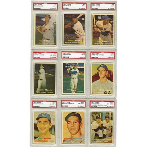 <B>1957 Topps Baseball Complete Set (407).</B></I> In 1957, Topps reduced the size of its cards to the now-familiar 2-1/2" x 3-1/2". In addition, real color photographs were used for the first time. The scarce cards in the set are numbers 265-352. A total of 21 have been graded by PSA with an aggregate SMR value of $2482. Graded cards - <B>PSA 7:</B></I> #10 Mays, 55 Banks, 170 Snider, 286 Richardson; <B>PSA 6:</B></I> #125 Kaline, 250 Mathews, 302 Koufax, 312 Kubek, 328 B. Robinson, 407 Yankee Power Hitters; <B>PSA 5:</B></I> #1 Williams, 20 Aaron (ST), 25 Ford, 29 Herzog, 35 F. Robinson, 76 Clemente, 210 Campanella, 400 Dodgers' Sluggers; <B>PSA 4:</B></I> #2 (MC) Berra, 30 Reese, 95 Mantle. Ungraded cards include #7 Aparicio (VG), 15 Roberts (EX/MT), 18 Drysdale (EX/MT), 24 Mazeroski (VG/EX), 38 Fox (VG/EX), 62 Martin (EX), 70 Ashburn (VG/EX), 80 Hodges (EX), 85 Doby (VG), 90 Spahn (EX), 97 Yankees Team (VG), 165 Kluszewski (EX), 175 Larsen (EX/MT), 212 Colavito (EX/MT), 270 Senators Team (VG/EX), 275 Indians Team (EX), 277 Podres (EX/MT), 284 Zimmer (EX/MT), 317 Giants Team (NM), 322 Reds Team (EX/MT), 324 Dodgers Team (VG), 329 White Sox Team (EX/MT), 338 Bunning (EX). Set grades 65% EX to EX/MT (some better), 35% VG to VG/EX.