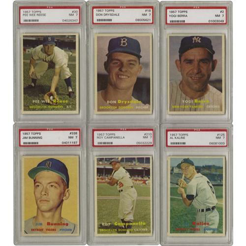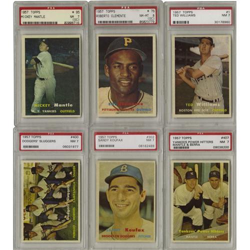 <B>1957 Topps Baseball Complete Set (411).</B></I> In 1957, Topps reduced the size of its cards to the now-familiar 2-1/2" x 3-1/2". In addition, real color photographs were used for the first time. The scarce cards in the set are numbers 265-352. Also included in this offering are three checklists and a contest card. A total of thirty-five cards have been graded by PSA, breaking down as follows: <B>PSA 8:</B></I> #76 Clemente (OC), 312 Kubek (OC); <B>PSA 7:</B></I> #1 Williams, 2 Berra, 18 Drysdale, 30 Reese, 65, 95 Mantle (OC), 125 Kaline, 130 Newcombe, 155, 162, 207, 210 Campanella, 250 Mathews, 286 Richardson, 298, 299, 302 Koufax, 314, 315, 318, 322 Cincinnati Reds, 326, 330, 338 Bunning, 344, 352, 360, 370, 372, 379, 400 Dodgers' Sluggers, 404, 407 Yankee Power Hitters. Graded cards have an aggregate SMR value of $3575. Ungraded cards include #7 Aparicio (EX/MT), 10 Mays (EX), 15 Roberts (NM), 20 Aaron (EX), 24 Mazeroski (VG), 25 Ford (EX), 35 F. Robinson (EX), 40 Wynn (EX), 55 Banks (EX/MT), 62 Martin (NM), 70 Ashburn (EX/MT), 80 Hodges (EX), 90 Spahn (NM), 165 Kluszewski (EX/MT), 170 Snider (EX), 203 Wilhelm (EX/MT), 212 Colavito (NM), 328 B. Robinson (EX), Checklist 1/2 (G), Checklist 3/4 (G/VG), Checklist 4/5 (VG/EX), June Contest Card (VG/EX). Grades 57% NM to NM/MT, 43% EX to EX/MT or lesser. <BR><BR><B>Important notice:</B> Heritage usually auctions material at the rate of 200-250 lots per hour. On some occasions eBay Live bid software or the Internet may not be able to keep up with the pace of the auction. We recommend placing a realistic absentee bid now as insurance to avoid disappointment. Occasionally the auctioneer may eliminate or reject an eBay Live bid, and the auctioneer may also reopen a lot after the close of the eBay live bidding (usually because we missed an audience bid), and may reject your bid even if it shows you as the winning bidder. By bidding via eBay Live, you agree that Heritage may award the lot to another bidder at its sole discretion under the circumstances described above or any other reasonable circumstances. Since eBay bids are not shown to us until we open the lot on the floor, we treat those bids just like floor bids. In most cases the floor responds before the eBay bid is presented to us, due to Internet lag time, so for consistency we have made it a policy that floor bids are always considered first over tie eBay live bids. Also please note that all Heritage lots purchased through eBay Live carry a 22.5% Buyer's Premium. Please make sure you read the Terms and Conditions before you bid. This lot is being auctioned in conjunction with a live floor auction by Heritage Galleries & Auctioneers. All final auction and invoice information will be supplied by Heritage Galleries & Auctioneers, and all other information should be considered preliminary. Lot:19574 <BR><BR><B>Winning Notification and Billing:</B> After the FINAL session in this auction is complete, Heritage will send e-mail and snail mail invoices. This process normally takes several days. All final auction and invoice information will be supplied by Heritage Galleries & Auctioneers, and all other information should be considered preliminary. <BR><BR>This auction will be conducted on a live auction floor and over the Internet through eBay Live. If you choose to place an absentee bid, please take a moment to <font color='#0000ff'><u><a href='http://pages.ebay.com/liveauctions/help/before/laabsentee.html'>learn how eBay Live absentee bidding works</a></u></font><font color='#000000'>