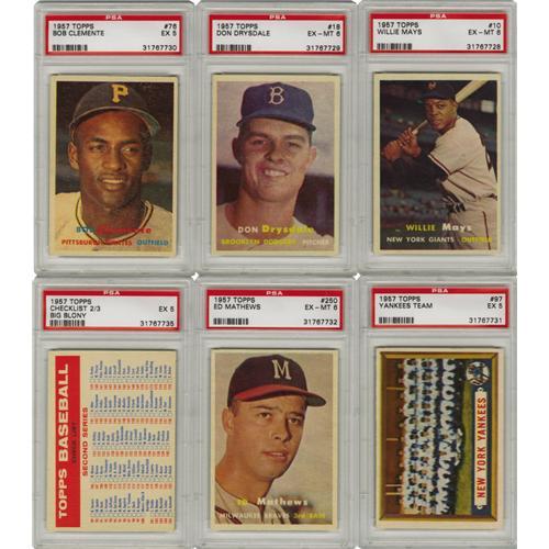 <B>1957 Topps Baseball Complete Set (412).</B></I> This is the first Topps issue to feature full color photographs with a nice mix of action and portrait images. The 407 card issue represented their largest offered to that date. This complete set includes all four checklists and a contest card. A total of seven cards have been graded by PSA with an aggregate SMR value of $705. Graded cards - <B>PSA NM-MT 8:</B></I> #217 Stephens; <B>PSA EX-MT 6:</B></I> #10 Mays, 18 Drysdale, 250 Mathews; <B>PSA EX 5:</B></I> #76 Clemente, 97 Yankees Team, Checklist 2/3. Ungraded cards include #1 Williams (GD), 2 Berra (VG), 7 Aparicio (VG), 15 Roberts (EX), 20 Aaron (VG), 24 Mazeroski (EX), 25 Ford (EX), 30 Reese (VG/EX), 35 Robinson (VG/EX), 55 Banks (VG/EX), 62 Martin (color added and trimmed, top border), 70 Ashburn (VG/EX), 80 Hodges (EX), 90 Spahn (VG/EX), 95 Mantle (VG), 125 Kaline (EX), 165 Kluszewski (VG/EX), 170 Snider (GD), 210 Campanella (VG/EX), 286 Richardson (EX), 302 Koufax (VG/EX), 312 Kubek (EX), 328 Robinson (VG), 338 Bunning (PR), 400 Dodgers' Sluggers (VG/EX), 407 Yankees' Power Hitters (VG), Checklist 1/2 (PR), Checklist 3/4 (PR), Checklist 4/5 (PR), Contest Card #3 (FR). Grades 43% EX to EX/MT (some better), 53% VG to VG/EX, 4% PR to GD.<BR><BR><b>Shipping:</b> Trading Card Set, Medium (<a target="_blank" href="http://www.heritageauctions.com/common/shipping.php">view shipping information</a>)