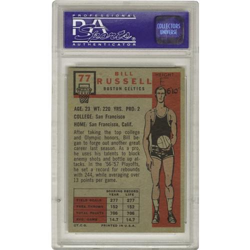 <B>1957 Topps Bill Russell #77 PSA EX-MT 6.</B></I> The famous Topps card company makes its first foray into photography, capturing the lean Hall of Fame frame of this dominating Boston Celtics center. Pack-fresh gloss is paired with just the slightest hint of wear, and we suspect that the mild northwestern shift in centering is all that keeps the grade from rising a point or two higher. Still a Championship example.<BR><BR><b>Shipping:</b> Sportscard (<a target="_blank" href="http://www.heritageauctions.com/common/shipping.php">view shipping information</a>)