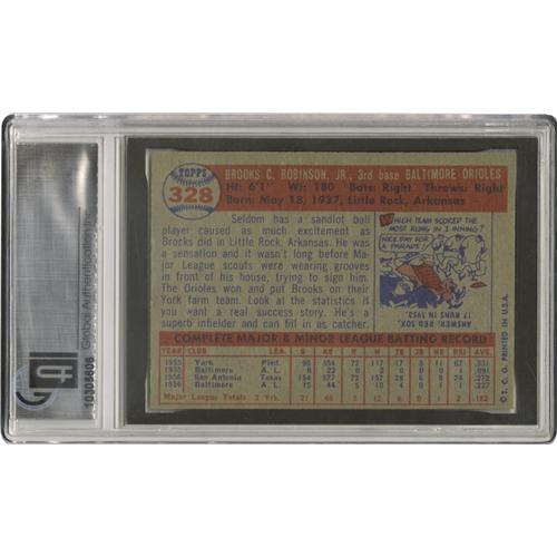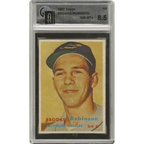 <B>1957 Topps Brooks Robinson #328 GAI NM-MT+ 8.5.</B></I> Public enemy number one to ground balls to the left side is presented here on rookie cardboard from one of Topps' most celebrated sets, the first to feature photography. This top drawer example offers few opportunities for criticism, with pack-fresh gloss and corners, and only 40/60 left right centering to deny an even higher score. Hard to believe this one is half a century old.<BR><BR><b>Shipping:</b> Sportscard (<a target="_blank" href="http://www.heritageauctions.com/common/shipping.php">view shipping information</a>)