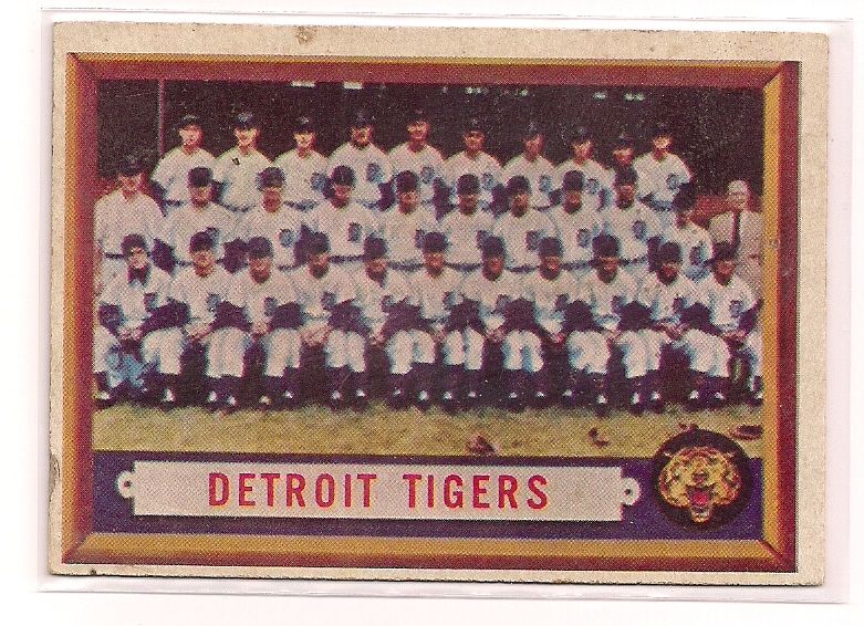1957 Topps Detroit Tigers Team Card #198. This card has a Team Picture of the Detroit Tigers on the front, with All-Time Tiger Leader Stats on the back. This card is in Excellent Condition.