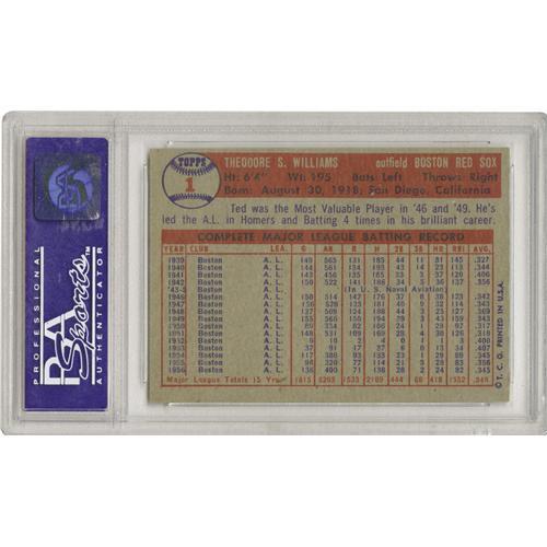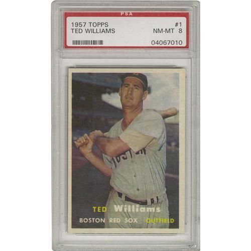 <B>1957 Topps Ted Williams #1 PSA NM-MT 8.</B></I> While the appearance as the number one card in a set is intended to be an honor, such a designation in the earlier days of gum card collecting was fraught with peril as the first and last cards in a collected set tended to bear the brunt of the elements. As a result, we find very few examples of the '57 Ted Williams card that can hold a candle to this one, which boasts razor-sharp corners and marvelous gloss to justify its lofty grade.<BR><BR><b>Shipping:</b> Sportscard (<a target="_blank" href="http://www.heritageauctions.com/common/shipping.php">view shipping information</a>)