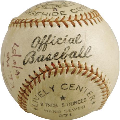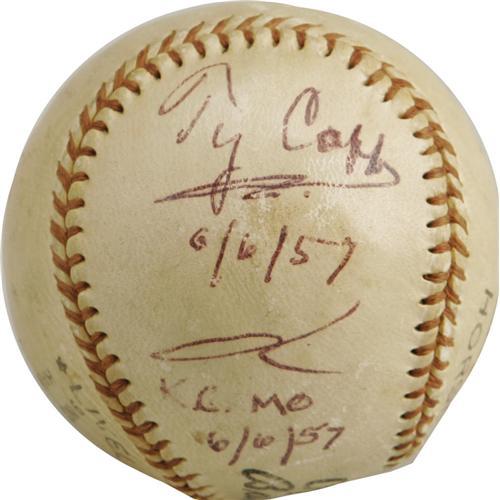 <B>1957 Ty Cobb Single Signed Baseball.</B></I> The seventy-one year old terror of the Dead Ball Era has never looked better than he does here upon this "Reach Official League" ball signed for a fan in Kansas City, Missouri. Cobb's side panel blue ink autograph rates a magnificent 9+/10, and is underscored by the date of "6/6/57" in his hand. Just beneath, the original owner used the same pen to note the location, "K.C., MO," and reassert the date of the signing, though these factors do nothing to diminish the tremendous visual appeal. While Cobb checks and letters are fairly readily available in the collecting community, single signed baseballs such as this are far more scarce and desirable, particularly such high-grade specimens as the one we present here. Just the slightest bit of surface wear is noted purely for accuracy's sake, and our catalog imagery should illustrate just how insignificant these concerns are. Certainly this ranks very close to the top of the small heap of available examples, and deserves a home in the finest of private collections. <I>LOA from PSA/DNA. LOA from James Spence Authentication.</B></I><BR><BR><b>Shipping:</b> Balls, Pucks, etc., Small (<a target="_blank" href="http://www.heritageauctions.com/common/shipping.php">view shipping information</a>)
