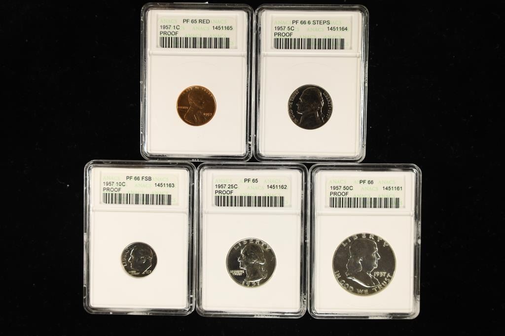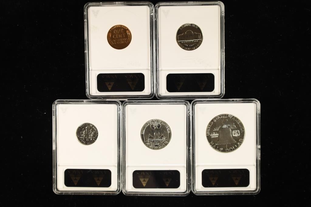CENT PF65 RED, JEFFERSON NICKEL PF66 6 STEPS, ROOSEVELT DIME PF66 FSB, WASHINGTON QUARTER PF65 AND FRANKLIN HALF DOLLAR PF66
