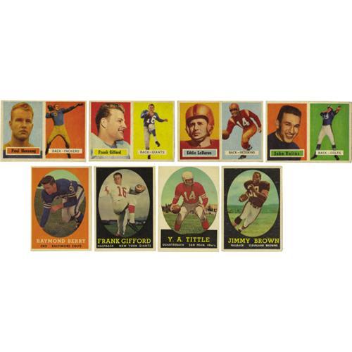 <B>1957 and 1958 Topps Football Complete Sets.</B></I> Offered here are two early Topps football sets which contain some of the most important rookies of the era including Unitas (EX), Starr (VG/EX), and Hornung (EX/MT) in the 1957 set along with Brown (VG) and Jurgensen (VG/EX) in the 1958 set. The 1957 set consists of 154 cards and grades as 5% NM or better, 65% EX to EX/MT, and 30% VG/EX or lesser. The 1958 Set of 132 cards grades 78% EX to EX/MT and 22% VG/EX or lesser. <BR><BR><B>Important notice:</B> Heritage usually auctions material at the rate of 200-250 lots per hour. On some occasions eBay Live bid software or the Internet may not be able to keep up with the pace of the auction. We recommend placing a realistic absentee bid now as insurance to avoid disappointment. Occasionally the auctioneer may eliminate or reject an eBay Live bid, and the auctioneer may also reopen a lot after the close of the eBay live bidding (usually because we missed an audience bid), and may reject your bid even if it shows you as the winning bidder. By bidding via eBay Live, you agree that Heritage may award the lot to another bidder at its sole discretion under the circumstances described above or any other reasonable circumstances. Since eBay bids are not shown to us until we open the lot on the floor, we treat those bids just like floor bids. In most cases the floor responds before the eBay bid is presented to us, due to Internet lag time, so for consistency we have made it a policy that floor bids are always considered first over tie eBay live bids. Also please note that all Heritage lots purchased through eBay Live carry a 22.5% Buyer's Premium. Please make sure you read the Terms and Conditions before you bid. This lot is being auctioned in conjunction with a live floor auction by Heritage Galleries & Auctioneers. All final auction and invoice information will be supplied by Heritage Galleries & Auctioneers, and all other information should be considered preliminary. Lot:19293 <BR><BR><B>Winning Notification and Billing:</B> After the FINAL session in this auction is complete, Heritage will send e-mail and snail mail invoices. This process normally takes several days. All final auction and invoice information will be supplied by Heritage Galleries & Auctioneers, and all other information should be considered preliminary. <BR><BR>This auction will be conducted on a live auction floor and over the Internet through eBay Live. If you choose to place an absentee bid, please take a moment to <font color='#0000ff'><u><a href='http://pages.ebay.com/liveauctions/help/before/laabsentee.html'>learn how eBay Live absentee bidding works</a></u></font><font color='#000000'>
