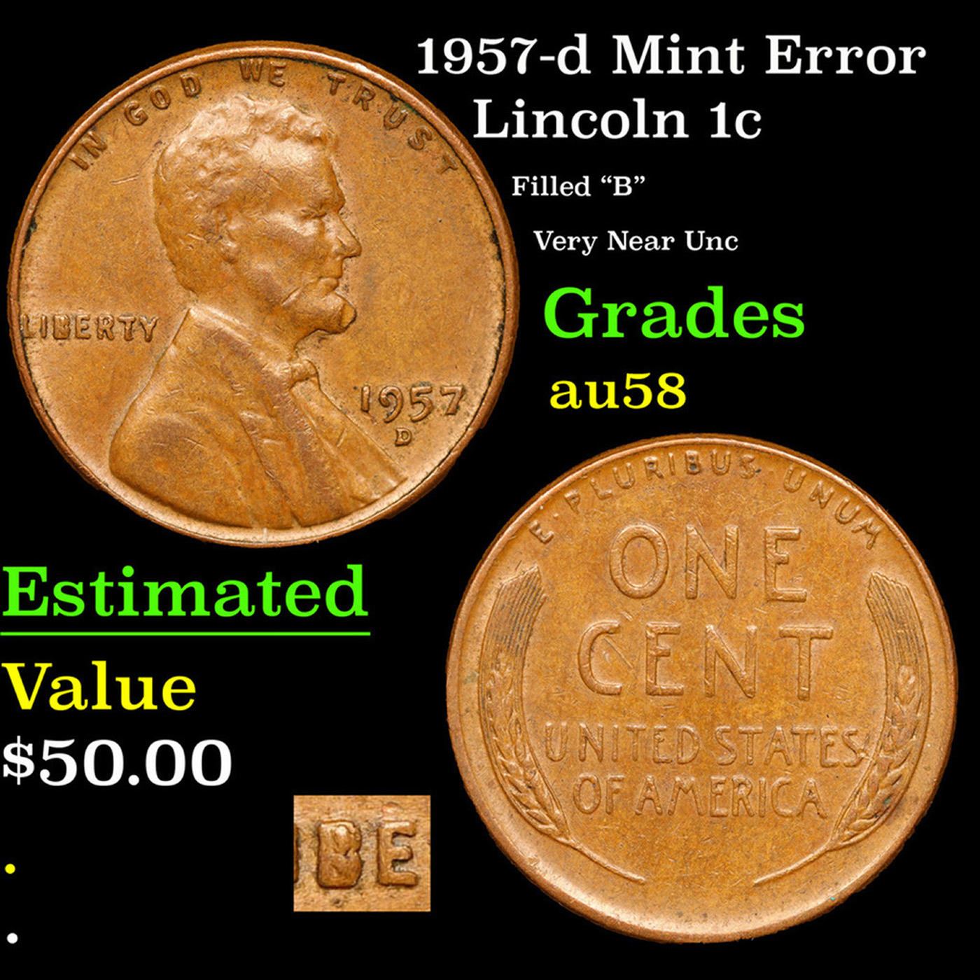 1957-d Mint Error Lincoln Cent 1c Grades Choice AU/BU Slider.