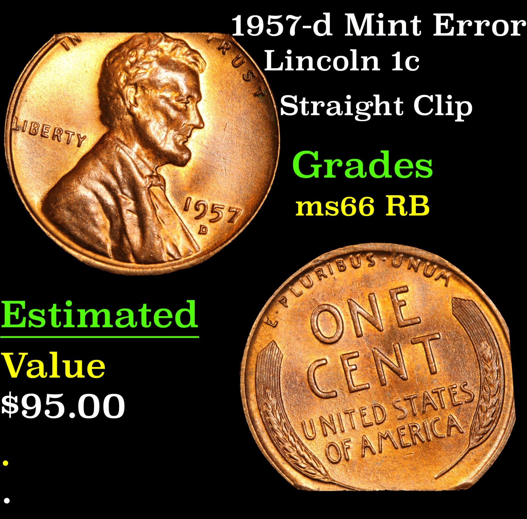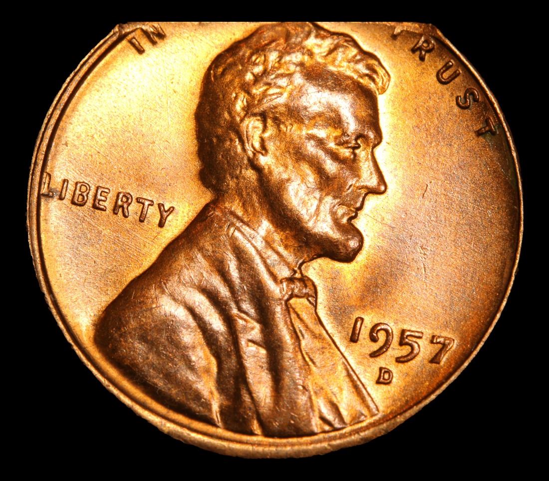 1957-d Mint Error Lincoln Cent 1c Grades GEM+ Unc RB. Straight Clip