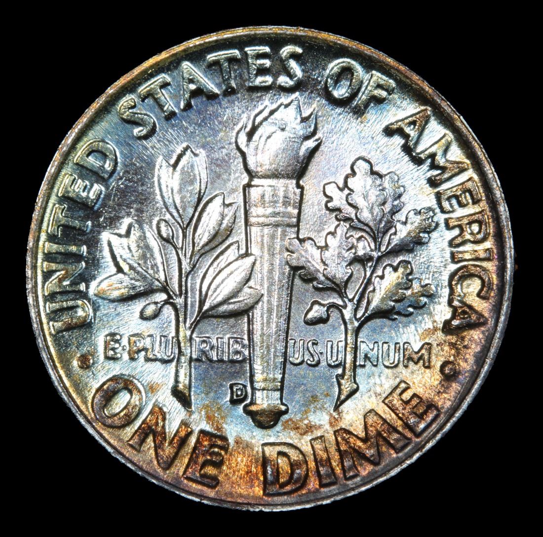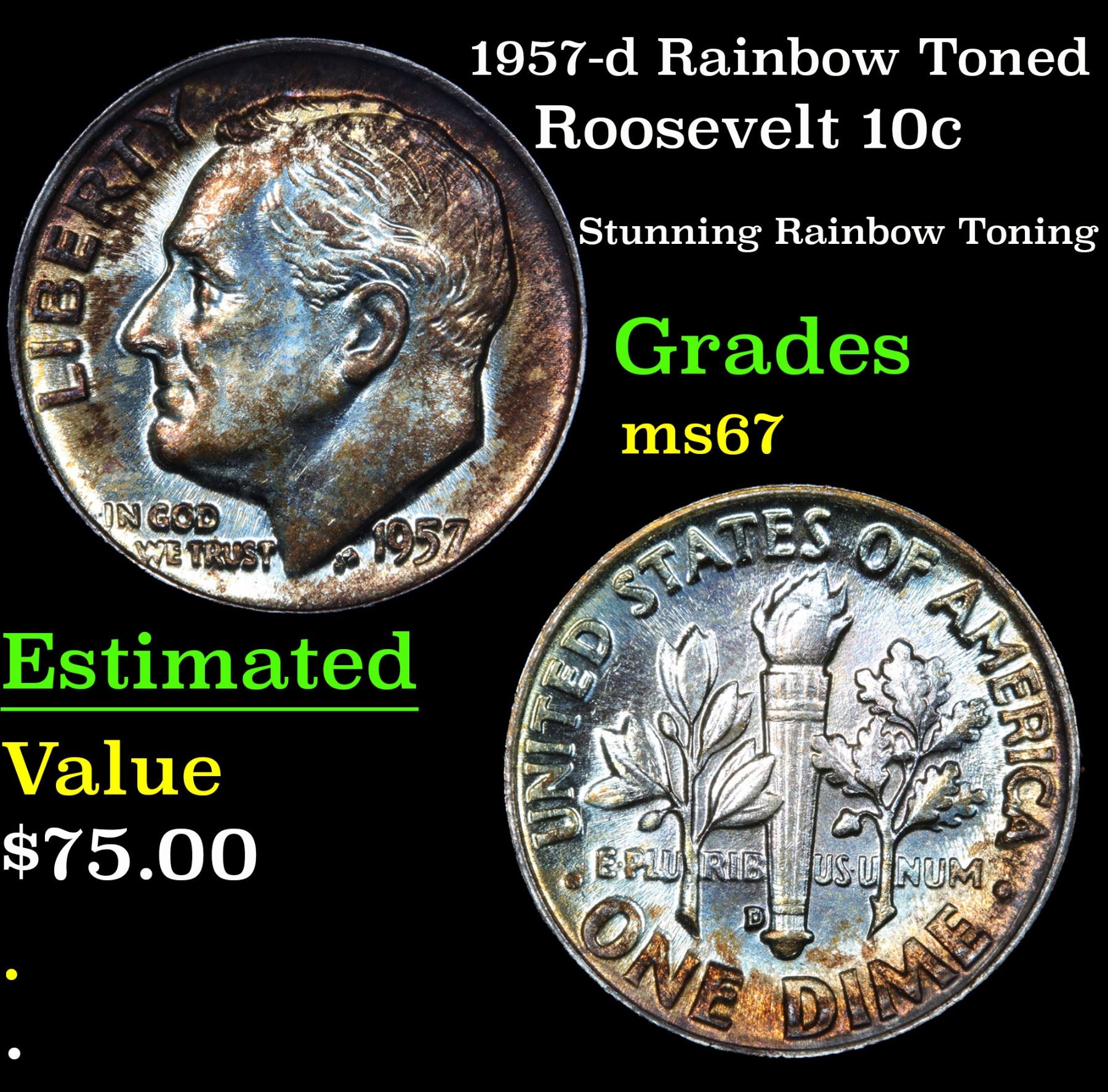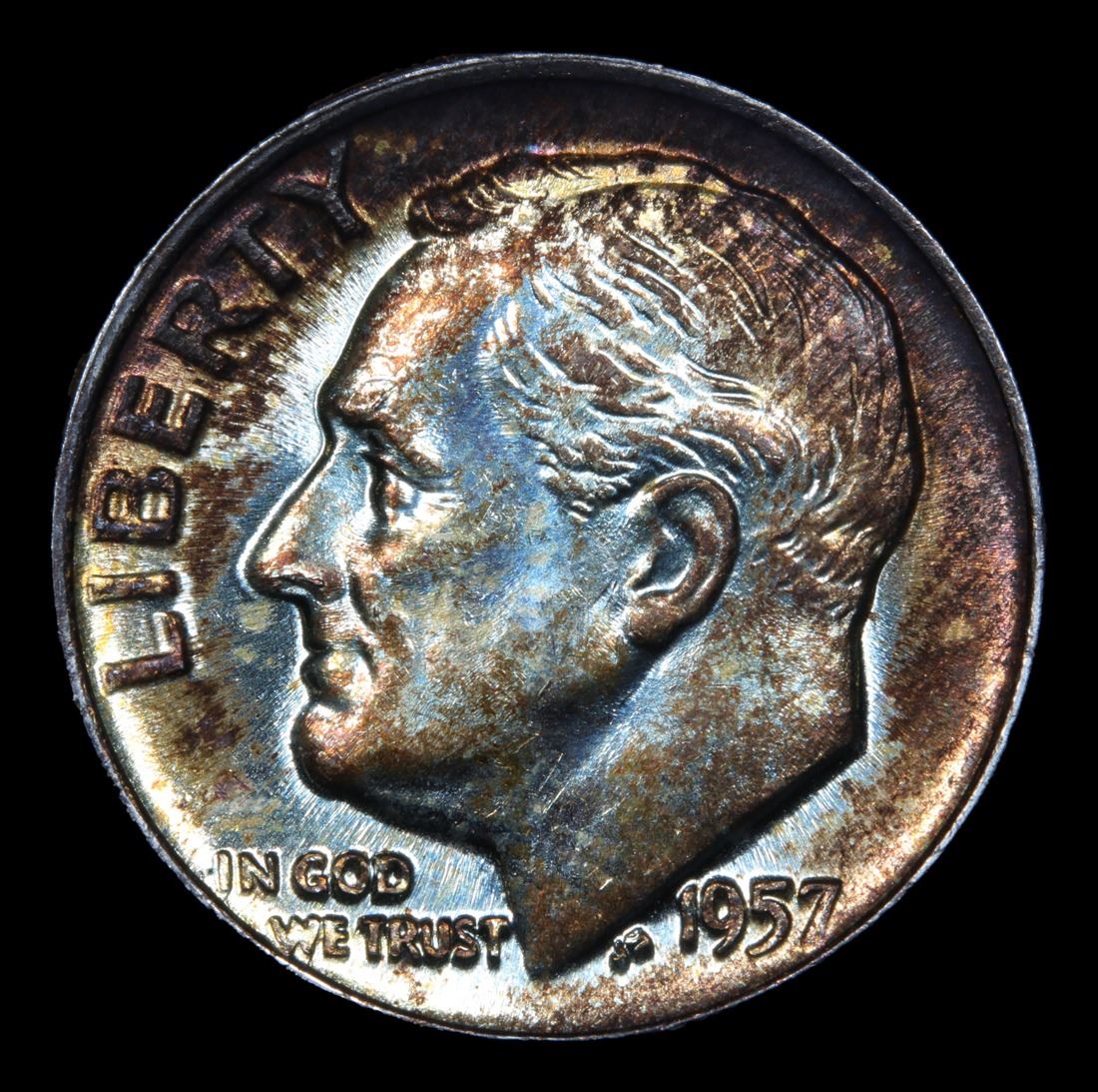 1957-d Rainbow Toned Roosevelt Dime 10c Grades GEM++ Unc. Stunning Rainbow Toning