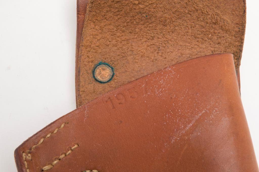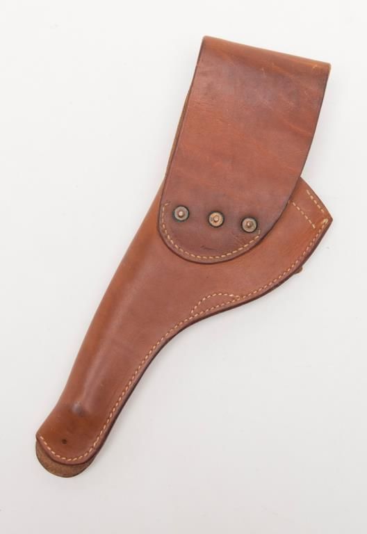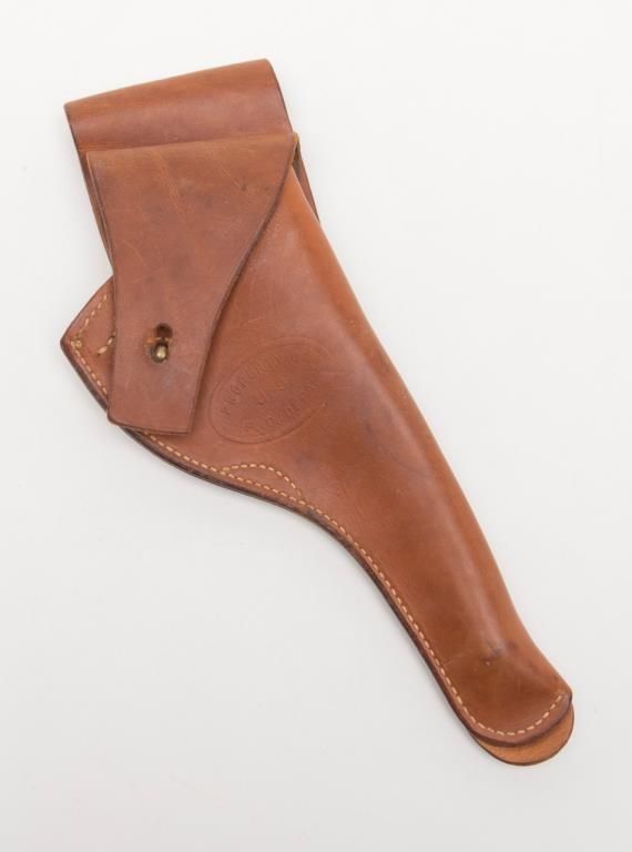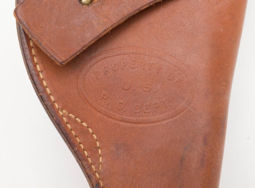 1957 dated flap holster in military style for 6” Colt New Service showing property of U.S. Post Office embossed on the front. Large military style belt loop secured by 3 rivets. Near fine and used condition with just some minor scratches andslight aging. Est.: $175-$350