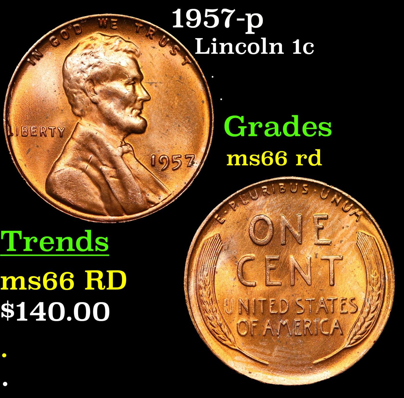 1957-p Lincoln Cent 1c Grades GEM+ Unc RD.