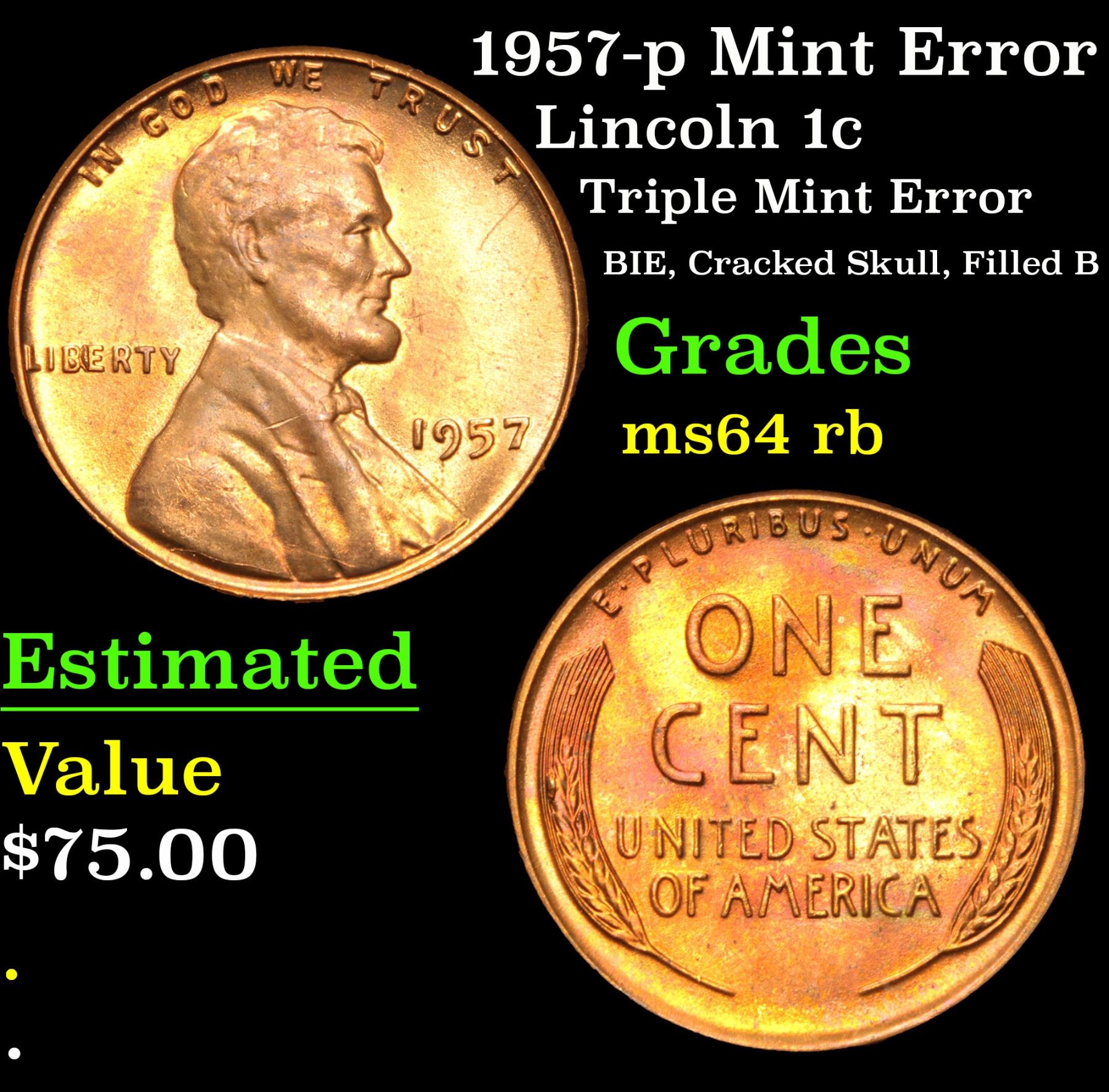 1957-p Mint Error Triple Mint Error BIE, Cracked Skull, Filled B Lincoln Cent 1c Grades Choice RB.