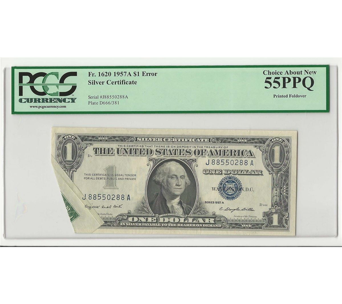 One 1957A $1 Silver Certificate Note Foldover ERROR PCGS 55PPQ. PCGS Graded.