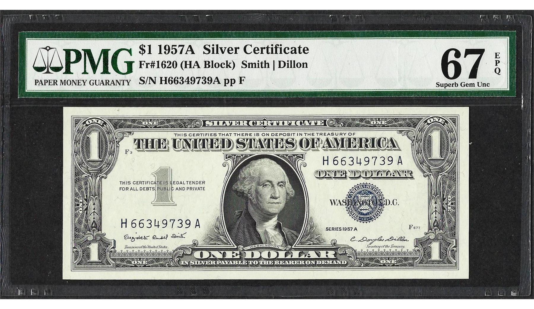 One 1957A $1 Silver Certificate Note Fr.1620 PMG Superb Gem Uncirculated 67EPQ. PMG Certified.