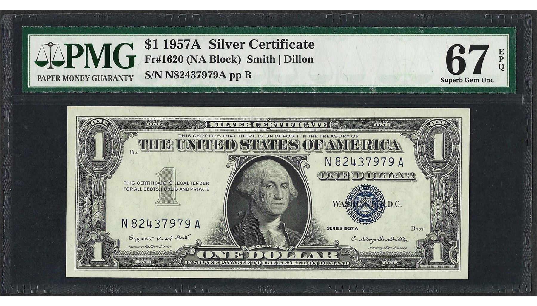 One 1957A $1 Silver Certificate Note Fr.1620 PMG Superb Gem Uncirculated 67EPQ. PMG Certified.