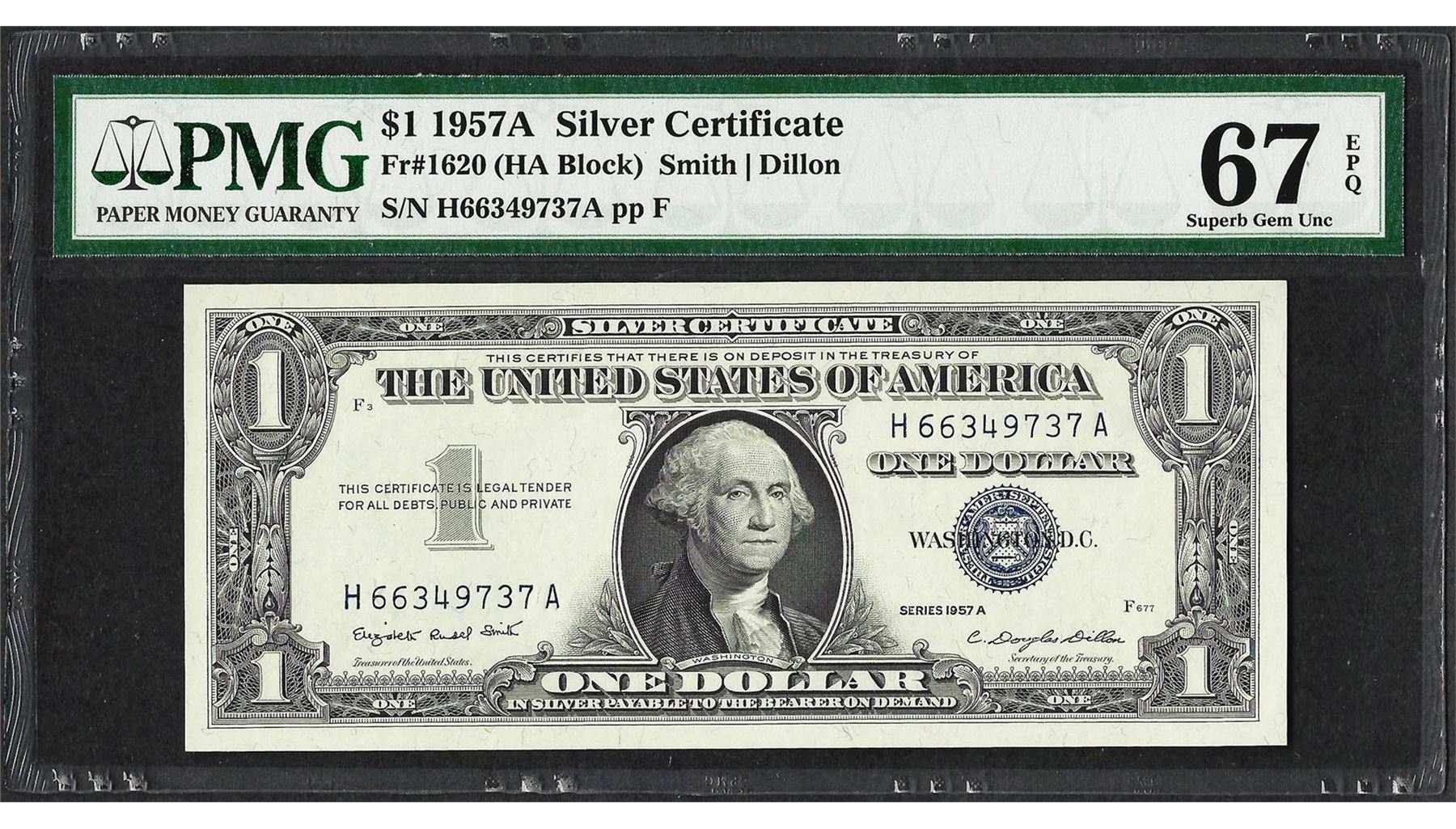 One 1957A $1 Silver Certificate Note Fr.1620 PMG Superb Gem Uncirculated 67EPQ. PMG Appraised.