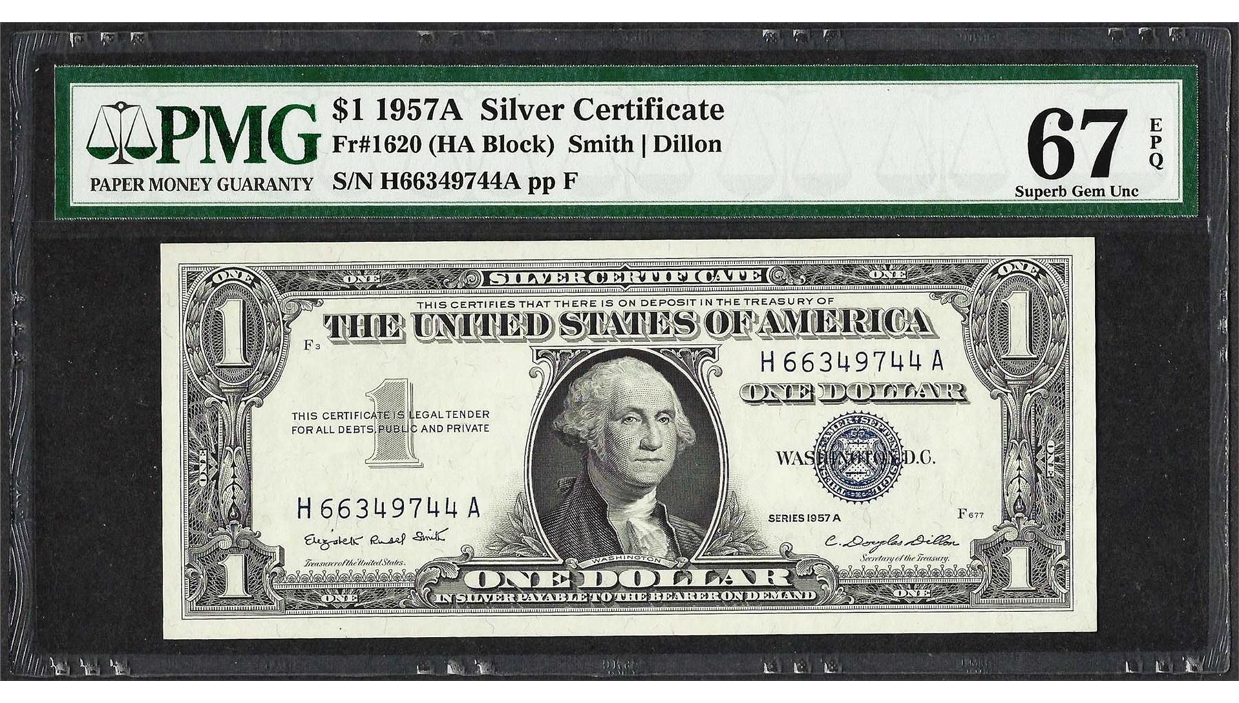 One 1957A $1 Silver Certificate Note Fr.1620 PMG Superb Gem Uncirculated 67EPQ. PMG Certified.